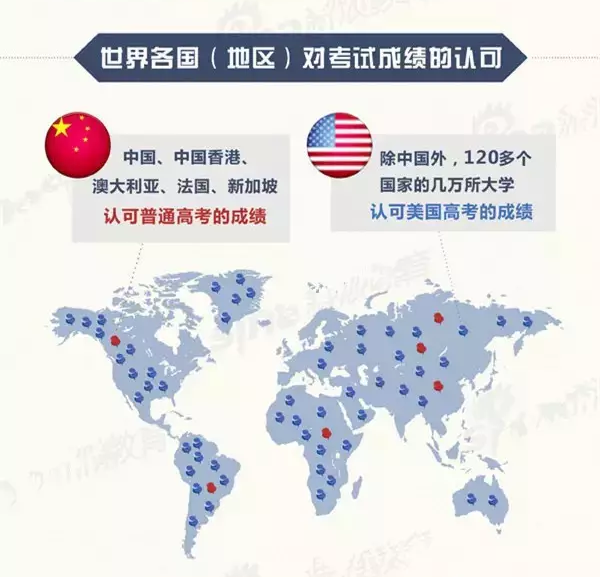 目前就中國的普通高考與美國高考相比,4個國家認可普通高考成績,學(xué)生的認可度稍顯弱并對之后的留學(xué)目的國選擇有所限制;相反,120多個國家的幾萬所大學(xué)認可美國高考的成績,可見,擁有美國高考成績的學(xué)生猶如有一張國家“通行證”。