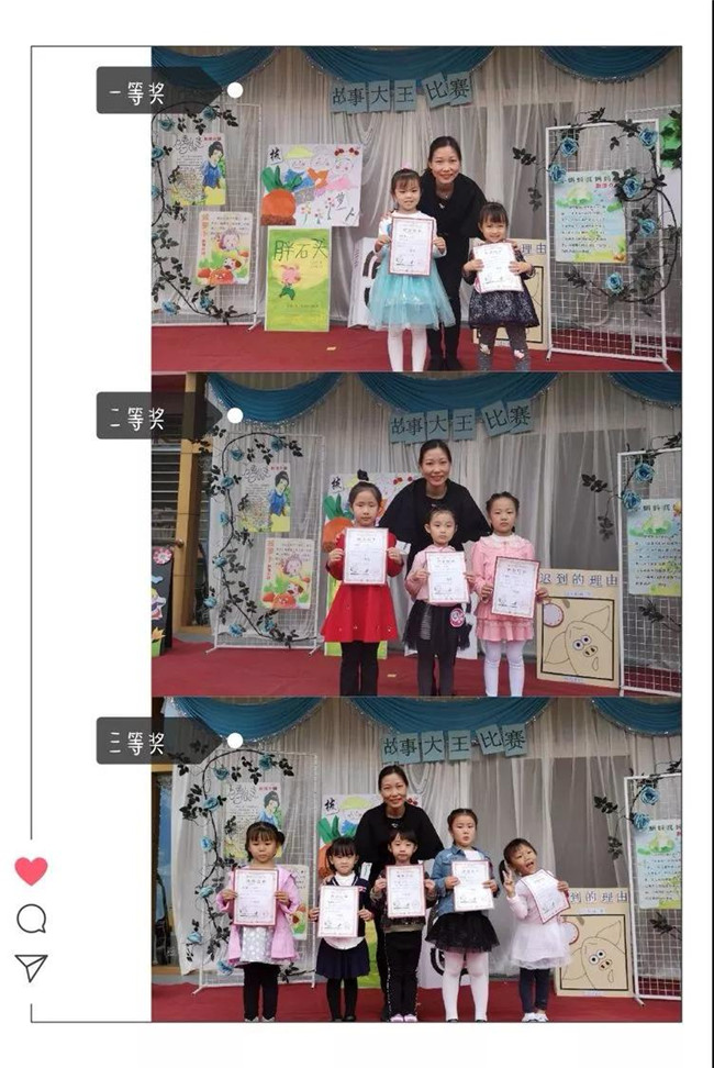比賽中,孩子們個(gè)個(gè)落落大方,動(dòng)作惟妙惟肖,表情形象豐富,故事內(nèi)容豐富生動(dòng),富有童趣。孩子們精彩、自信的表演,讓所有的聽眾都跟著他們的故事情節(jié)深入其中,贏得了老師們的陣陣掌聲,最后經(jīng)過評(píng)委老師們的評(píng)判,中班組肖沐妍和大班組的張鈺嘉獲得本次“故事大王”決賽的一等獎(jiǎng)!