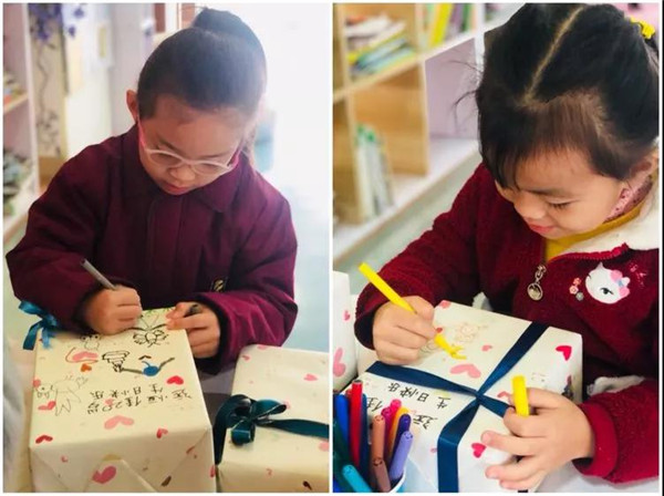 生日禮物也是別出心裁,孩子們真認(rèn)真的給包裝紙上進行繪畫裝飾呢!
