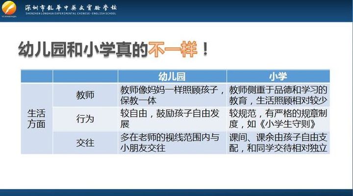 胡校長(zhǎng)在講座中提到,進(jìn)入小學(xué),幼兒所處的客觀環(huán)境、學(xué)習(xí)內(nèi)容、作息時(shí)間、自理要求、師生關(guān)系等都多方面都發(fā)生了較大的變化,許多方面都存在著斷節(jié)問(wèn)題,所以做好幼小銜接工作,做為家長(zhǎng)首先必須要明確幼兒園與小學(xué)的主要差異。