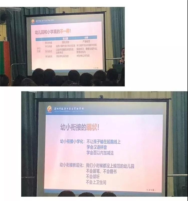 本次講座圍繞“幼升小環(huán)境變化的基本準備、幼小銜接的能力培養(yǎng)、幼小銜接的建議”三方面展開,通過PPT講解,引導家長從心理、生理及學習能力上幫助孩子走好人生第一步。