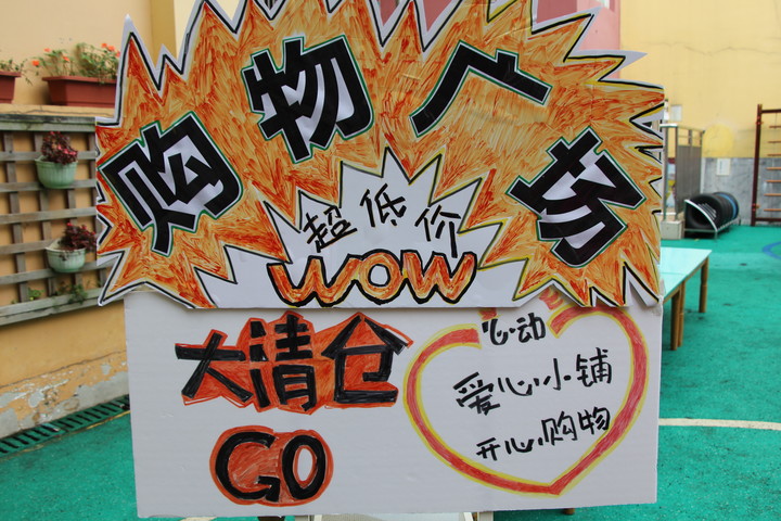 在義賣(mài)現(xiàn)場(chǎng),大家都精心設(shè)計(jì)了漂亮的招牌、宣傳廣告,豐富多彩的廣告標(biāo)語(yǔ)為今天的義賣(mài)增添了不色彩。看我們的小朋友們,坐在自己班的攤位前,家長(zhǎng)們也在一旁協(xié)助著,想出各色各樣的口號(hào)來(lái)吸引其他小顧客們的注意。孩子們紛紛扮演起小“老板”的角色,熱情的向往來(lái)的小“顧客”推銷(xiāo)自己的商品。
