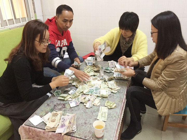 家長(zhǎng)代表、黃主任和財(cái)務(wù)一起清點(diǎn)捐款數(shù)額及轉(zhuǎn)帳