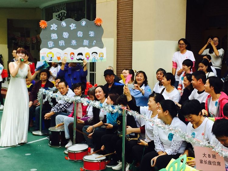 瞧!一旁的爸爸媽媽拉拉隊多么給力,敲鑼打鼓高喊口號為寶貝們加油~