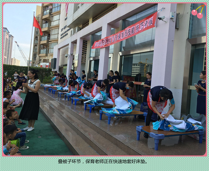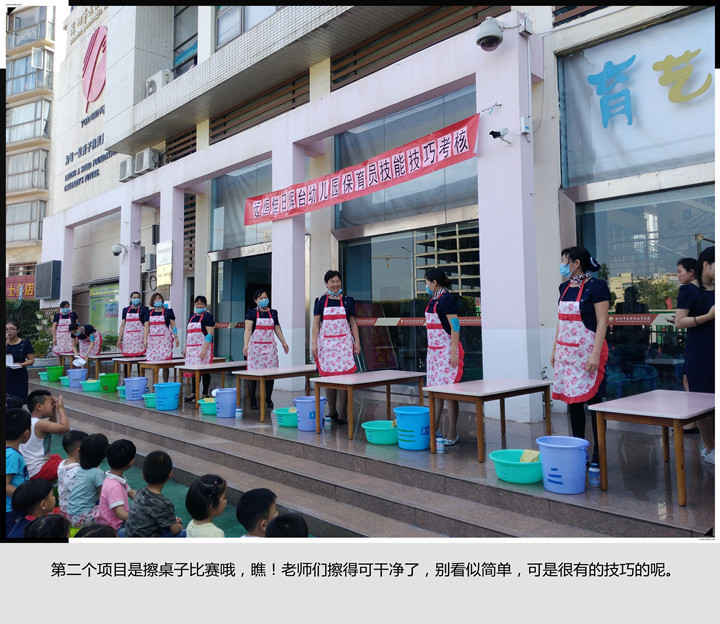 保育員是幼兒園中不可或缺的重要崗位,為了提升幼兒園保教隊伍的素質,真正做到“保教結合,教養(yǎng)并重”。我園舉行了一場別開生面的保育員技能技巧大賽。2017年4月19日上午,保育員技能技巧大賽拉開了序幕。此次活動由賴園長、江主任、王醫(yī)生擔任評委。本著公平公正、相互學習的態(tài)度評議各項技能。比賽中,保育員們在極短的時間內,動作規(guī)范、熟練快速地完成了整理床鋪、桌面消毒、美味水果三個項目。比賽現場氣氛雖緊張但是井然有序,每個人都各盡其能,展示了自己的風采。保育員們規(guī)范的操作流程,嫻熟的動作技能讓每一位評委嘆服!