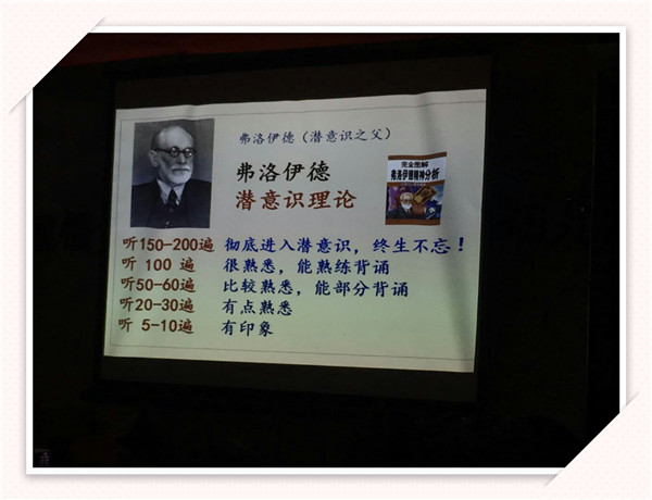 最后,譚老師指出了家長(zhǎng)的理解能力遠(yuǎn)勝于孩子,但孩子的記憶能力卻強(qiáng)于家長(zhǎng)。因此我們要開(kāi)盡可能地開(kāi)發(fā)孩子的記憶能力。而弗洛伊德的潛意識(shí)理論表明:當(dāng)我們聽(tīng)某個(gè)東西達(dá)150-200遍時(shí),它就徹底進(jìn)入我們的潛意識(shí),讓我們終生不忘!并且孩子早期的聽(tīng)力是十分敏捷地,他們能夠一心多用,同時(shí)接受多種信息。