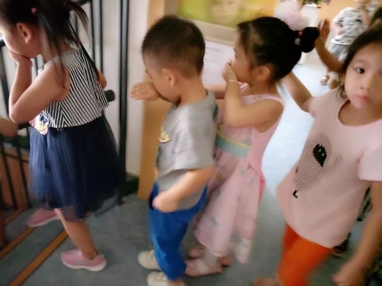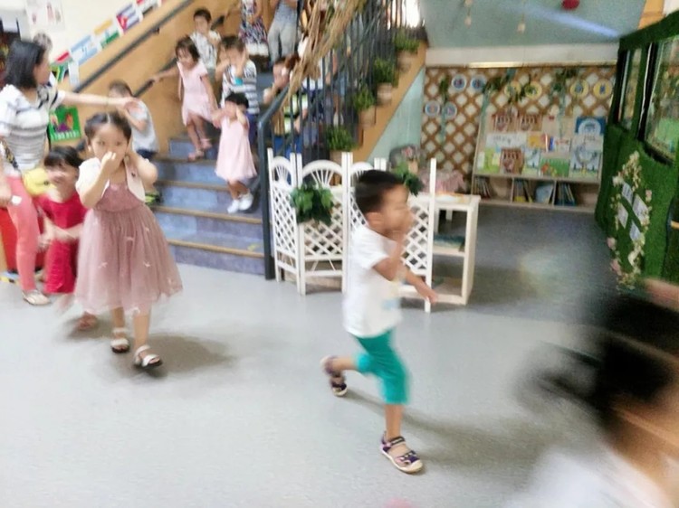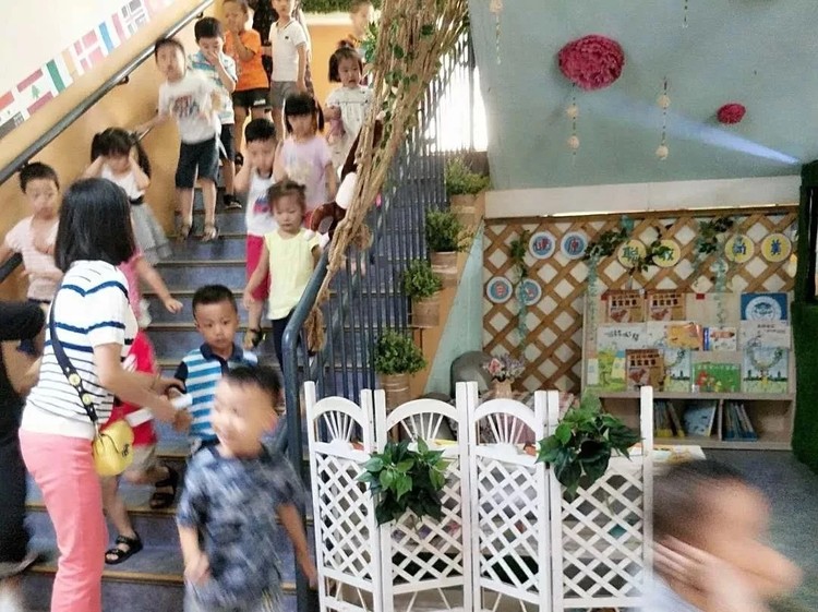 進(jìn)行消防演練前,幼兒園就像往常一樣開展各種活動(dòng)。上午11點(diǎn),隨著一陣急速的“笛”聲響起,各班老師聽到警鈴聲后迅速放下手頭工作,三位老師協(xié)調(diào)分工并立即帶領(lǐng)孩子們用手捂住口鼻,彎腰小步快走,分兩道樓梯有序地按規(guī)定路線到達(dá)指定的逃生安全區(qū)域。