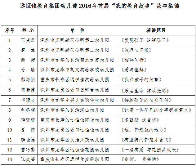 隨著深圳市讀書月的徐徐落幕,2016年11月30日,天高氣爽,鵬城上空、龍華中英文實(shí)驗(yàn)學(xué)校的校園彌漫著濃濃的書香……這一天深圳市遠(yuǎn)恒佳教育集團(tuán)幼教中心組織舉辦了首屆“我的教育故事”演講展示,活動(dòng)以集團(tuán)幼兒部“蒲公英早期閱讀特色教育方案”為依據(jù),以“講教育故事”為面、以“閱讀美好人生”、“書寫教育華章”為點(diǎn),弘揚(yáng)集團(tuán)“重文化”之精神,共享美好教育之歷程,展示師者之靚麗風(fēng)采。集團(tuán)幼教中心領(lǐng)導(dǎo)、教研員、各園園長(zhǎng)、行政、老師、家長(zhǎng)代表約200人參加了活動(dòng)。