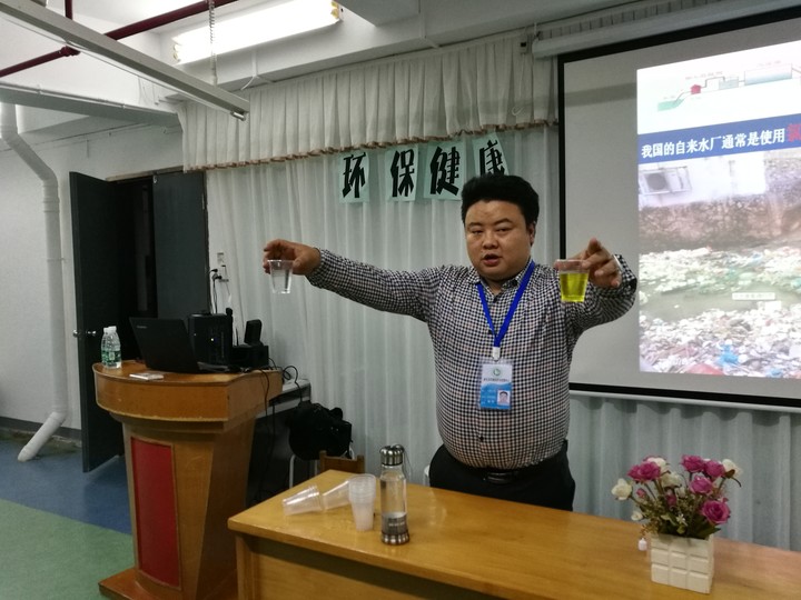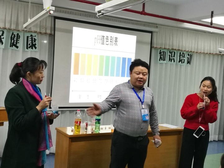 本次講座十分榮幸地請(qǐng)到了新生活環(huán)境保護(hù)與治理中心的唐維副主任,在第一個(gè)環(huán)節(jié)他向大家講解了什么是垃圾分類、垃圾分類的意義、以及垃圾可以分為可回收垃圾、廚余垃圾、有害垃圾、其他垃圾這四類。在第二個(gè)環(huán)節(jié)唐維副主任又向大家拋出一個(gè)問題--家庭環(huán)保你是否注意?首先,唐維副主任提出自來水的唯一處理方式是過濾。接著,他又提出水質(zhì)決定體質(zhì)這個(gè)觀點(diǎn),水可以分為呈酸性的水和呈堿性的水,而我們?nèi)梭w所需要的是堿性的水。最后,唐維副主任通過實(shí)驗(yàn)向大家展示了哪些是呈酸性的水,哪些呈堿性的水。通過這些生動(dòng)有趣的實(shí)驗(yàn),老師們初步了解到純凈水是呈酸性的水,而礦物質(zhì)水是呈堿性的水,因此我們平常應(yīng)該多喝礦物質(zhì)水。