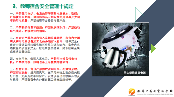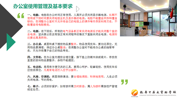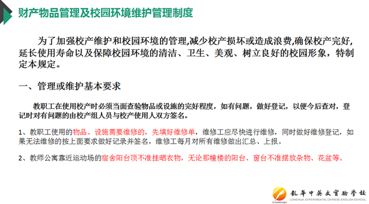 最后是對(duì)“學(xué)校安全、財(cái)產(chǎn)、節(jié)能等注意事項(xiàng)”進(jìn)行解讀,在此環(huán)節(jié),對(duì)環(huán)境衛(wèi)生、節(jié)水節(jié)能、物品保管、功能室及教學(xué)設(shè)備用具使用、安全管理安全教育及安全防護(hù)、物品借領(lǐng)及發(fā)放、校園車(chē)輛停放等工作、生活、安全方面的注意事項(xiàng)進(jìn)行了較簡(jiǎn)要的說(shuō)明,同時(shí)明確了老師們身上的工作責(zé)任。