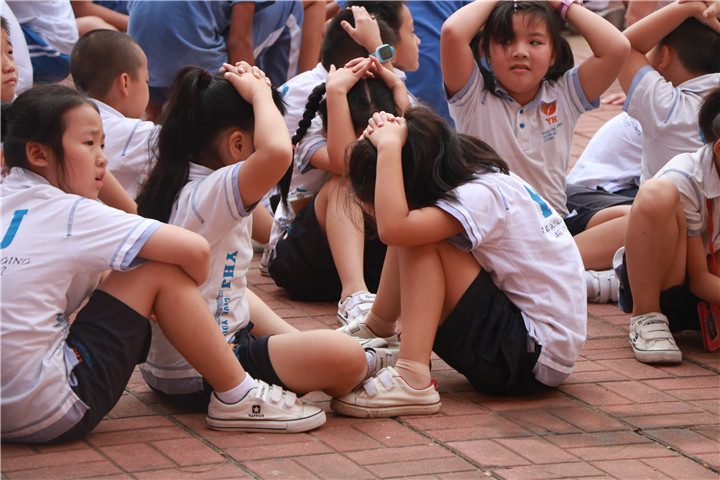第一階段,演練過程中,當(dāng)學(xué)生們聽到“地震發(fā)生”的信號,老師組織學(xué)生進行避震,反映迅速,動作標(biāo)準(zhǔn)。