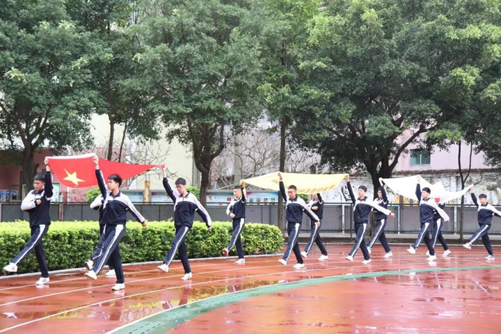 看!護(hù)旗手們踏著整齊的腳步來(lái)到升旗臺(tái)下;聽!莊嚴(yán)而又神圣的國(guó)歌響起;中英文實(shí)驗(yàn)學(xué)校全體師生在開學(xué)典禮上參加升旗儀式。