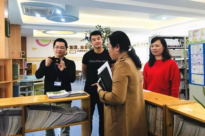 檢查組鄭旭彬、王怡峰兩位老師在學(xué)校金玉善副校長以及學(xué)校部門負(fù)責(zé)人的帶領(lǐng)下,重點(diǎn)查看了我校英語交流中心、學(xué)習(xí)資源中心、國際班課室、長廊文化展示、開放式英語小劇場等區(qū)域,對學(xué)校教育國際化特色的建設(shè)情況進(jìn)行了現(xiàn)場檢查。