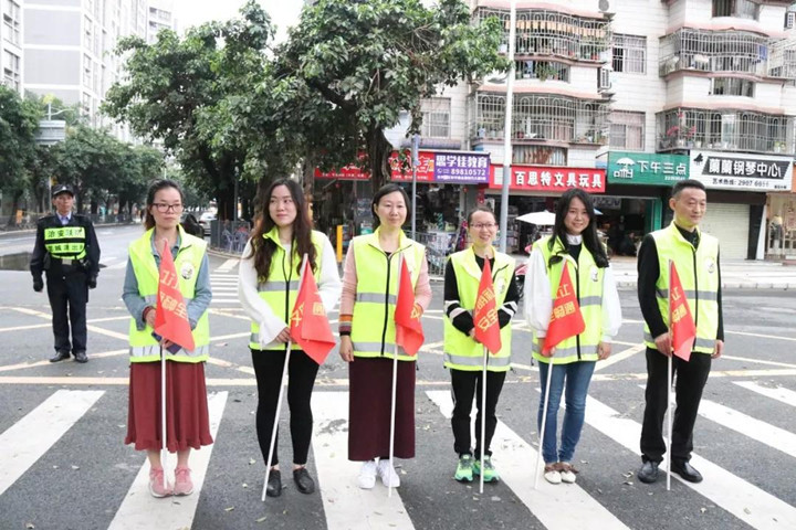 接著,一年級六名副班主任身穿家長義工服,手持指揮旗,分別在校門口六個崗位做好護航指揮?;顒油ㄟ^學(xué)生親身體驗,極大地增強了交通安全意識,提高了同學(xué)們過馬路的自護能力。