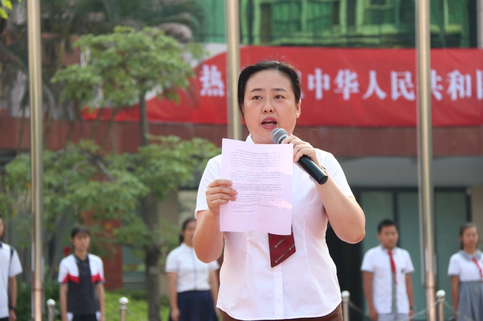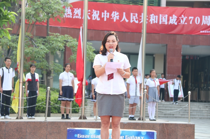 學(xué)校金玉善副校長進行了國旗下的講話。她首先表達(dá)了在偉大祖國70華誕來臨前,在莊嚴(yán)而又神圣的五星紅旗下講話的激動心情,簡要地向師生員工描述了革命先烈拋頭顱、灑熱血才換來我們今天美好生活的革命歷程,以及新中國成立以來創(chuàng)造的偉大而輝煌的成就。同時要求同學(xué)們珍惜今天來之不易的幸福生活,要胸懷祖國、勤奮學(xué)習(xí)、熱愛生活、遵紀(jì)守禮,做一名新時代的優(yōu)秀學(xué)生!