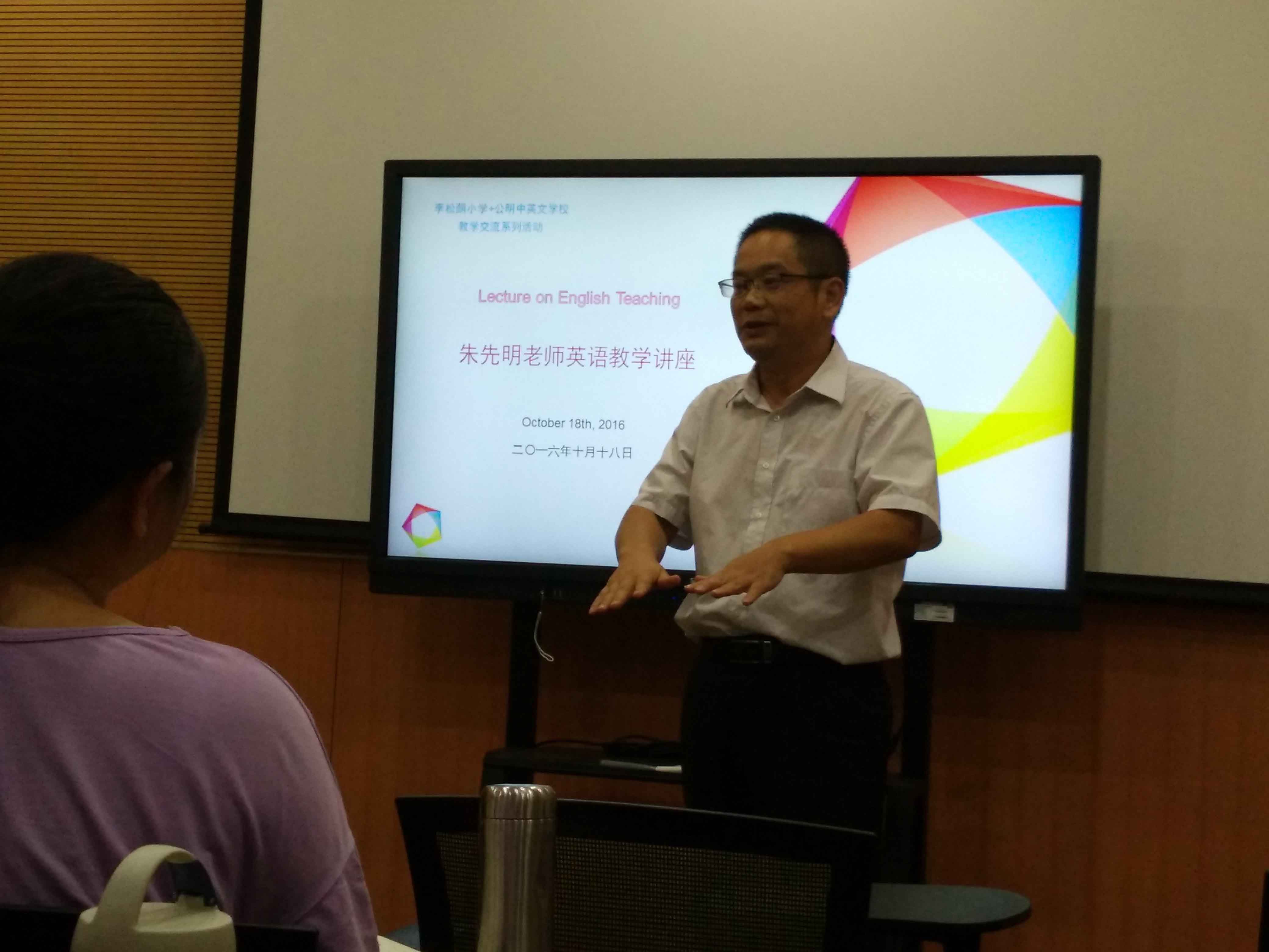 2016年10月18日,李松蓢小學朱先明老師在五(2)班為我們小學部英語組老師上了一節(jié)精彩的示范課,老師們都表示受益匪淺。從課堂開始的融洽師生關系、地道的英語語音、再加上課上朱老師的目標明確、具體、層次分明,再從關注學生的學習策略,都讓老師們佩服這位專家型的老教師的“以學生快樂學英語出發(fā)”精彩示范。