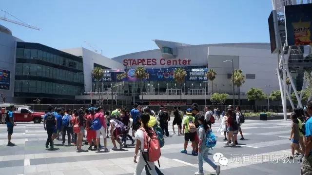 隨后,同學(xué)們來到了著名的斯臺(tái)普斯球館,這里,是著名的NBA球隊(duì)洛杉磯湖人以及洛杉磯快船隊(duì)的主場(chǎng),男生們迫不及待地在雕塑面前,與NBA名宿魔術(shù)師約翰遜,天溝賈巴爾等的雕像合影。