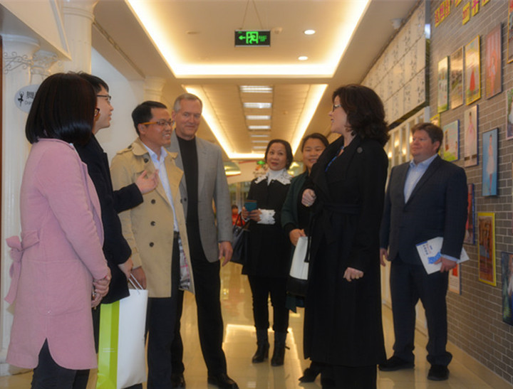 遠恒佳教育集團外事部部長宋騰先生帶領(lǐng)美國南岸學校校董夫婦Glenn Duncan &Holly Duncan、海外國際學校校長Bert Johnson、促進部主任 Jane Zhu一行人來到遠恒佳少年宮參觀指導,溫主任向來賓詳細介紹了遠恒佳少年宮的基本情況。