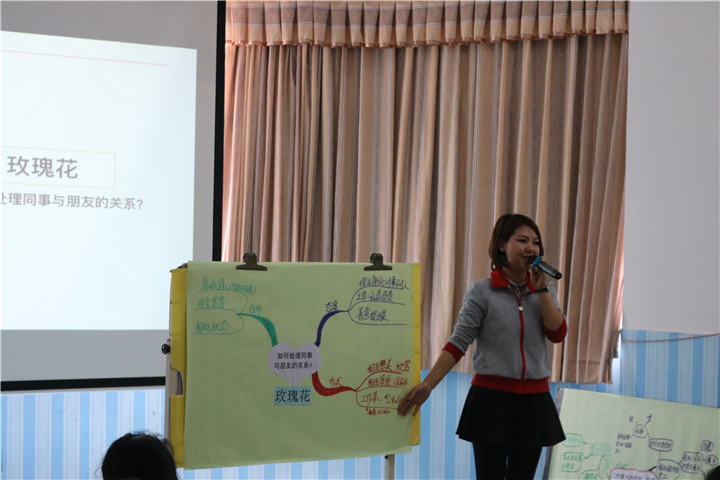 老師們被分成三組研討分析如何處理工作量大、搭檔不穩(wěn)定、如何平衡同事和朋友之間關(guān)系三個問題。老師們積極參與,各抒己見,遷移已有的經(jīng)驗來解決問題。