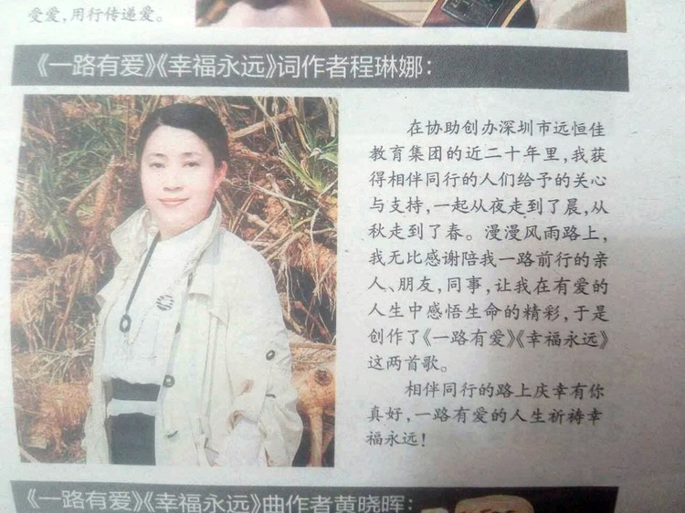《一路有愛》、《幸福永遠(yuǎn)》詞作者程琳娜創(chuàng)作感言: