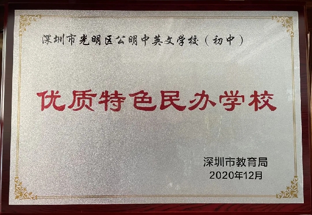 學(xué)校先后被評(píng)為全國(guó)民辦教育先進(jìn)單位、全國(guó)校園文化建設(shè)先進(jìn)單位、廣東省義務(wù)教育標(biāo)準(zhǔn)化學(xué)校、廣東省綠色學(xué)校、深圳市優(yōu)質(zhì)特色民辦學(xué)校(連續(xù)三屆)、深圳市德育示范校、深圳市平安校園示范校、深圳市青年文明號(hào)、光明區(qū)幸福校園示范校、光明區(qū)教育先進(jìn)單位、光明區(qū)初中教育特色學(xué)校。