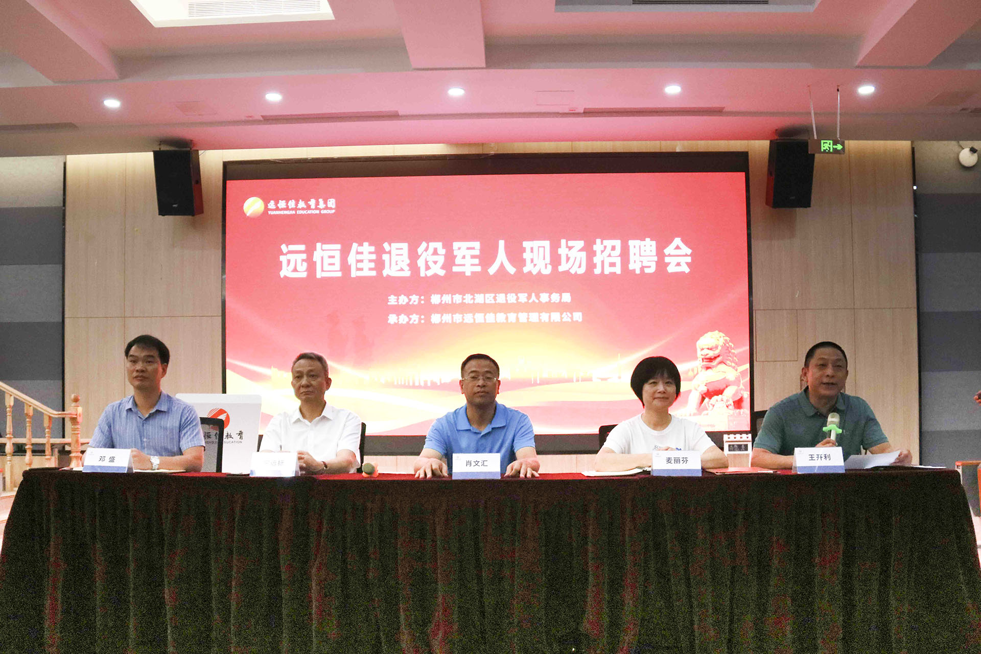 北湖區(qū)退役軍人事務(wù)局副局長(zhǎng)肖文匯(左三),遠(yuǎn)恒佳教育集團(tuán)黨總支書(shū)記、董事長(zhǎng)宋遠(yuǎn)標(biāo)(左二),集團(tuán)董事、副總裁麥麗芬(右二),郴州遠(yuǎn)恒佳學(xué)校副校長(zhǎng)鄧盛(左一)參加招聘會(huì),遠(yuǎn)恒佳郴州公司總經(jīng)理王開(kāi)利(右一)主持招聘會(huì)。