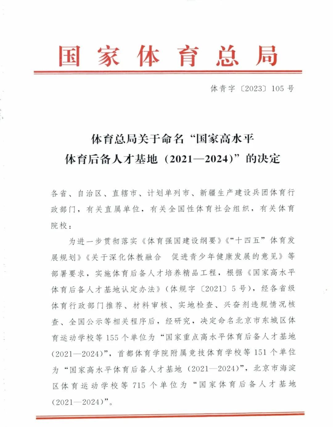 《關(guān)于命名“國家高水平體育后備人才基地