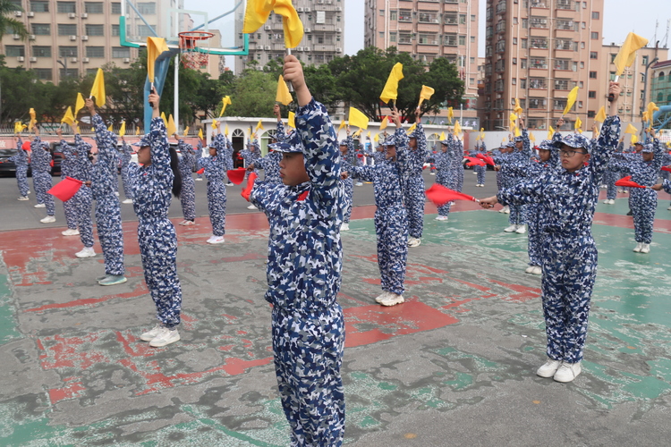 隨著音樂響起,同學(xué)們雙手拿旗,紅色和黃色的小旗,在同學(xué)們的手中翩翩起舞。舞出的海軍旗語(yǔ)操以其整齊劃一的動(dòng)作、虎虎生威的氣勢(shì)、團(tuán)結(jié)協(xié)作的精神,熟練地用揮旗動(dòng)作打出“無(wú)聲語(yǔ)言”。